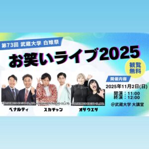 ※武蔵大学 第73回白雉祭「お笑いライブ 2025」に出演を予定しておりましたカラタチは、体調不良により出演を見合わせることとなりました。