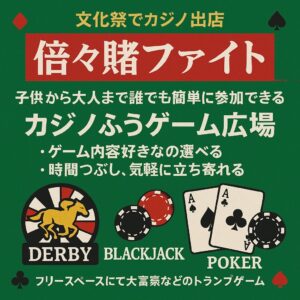子どもから大人まで誰でも楽しめる、カジノ風ゲーム広場!ルールは簡単だから初めてでも安心。ポーカーやブラックジャックなど、好きなゲームを自由に選べて、ちょっとした時間つぶしにもぴったり。気軽に非日常を味わえます!