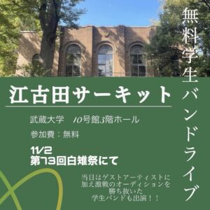 武蔵大学10号館3階ホールにて無料ライブを開催します!ゲストバンド2組に加え、日芸生、武蔵生の中から選ばれたプロ志向の学生バンドがオープニングアクトとして演奏します!